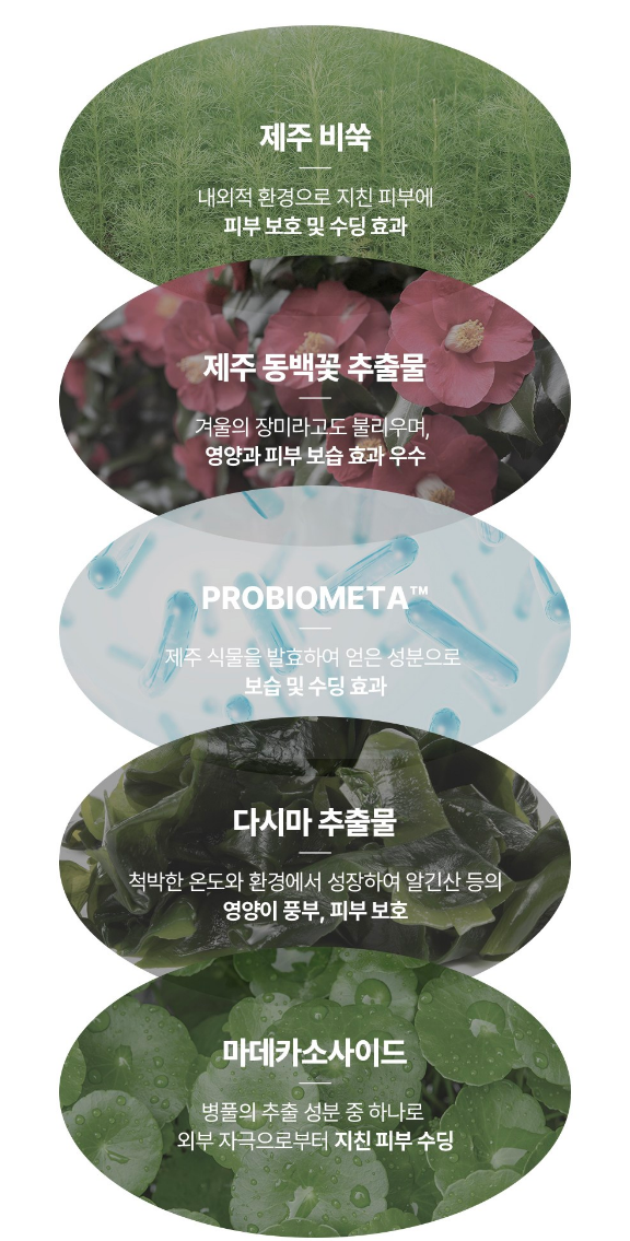 제주 비쑥, 제주 동백꽃 추출물 등의 제주도 유래 성분이 피부가 건조해지지 않도록 촉촉함을 지켜주고 다시마추출물, 마데카소사이드 성분의 수딩 효과로 피부를 편안하게 해줘요.
