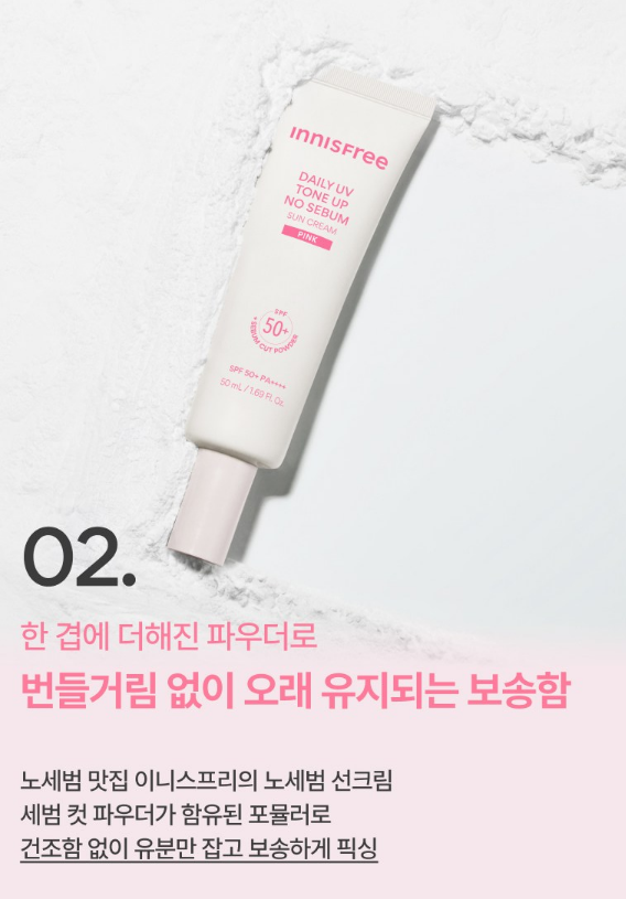 노세범 맛집 이니스프리의 노세범 선크림 세범 컷 파우더가 함유된 포뮬러로 건조함 없이 유분만 잡고 보송하게 픽싱돼요.