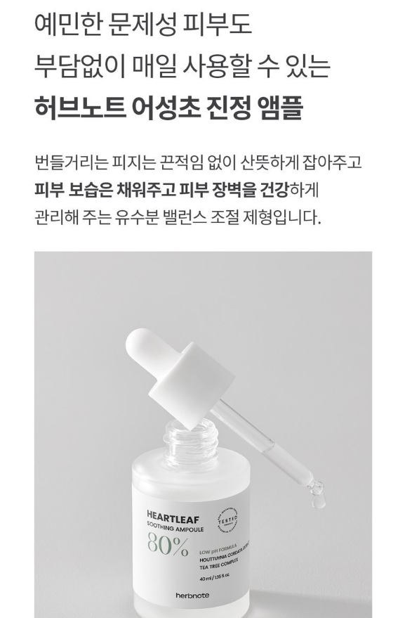 허브노트 어성초 진정 앰플은 민감 피부와 자극 받은 피부에 순한 진정을 돕고 당김 없이 피부결 케어에 도움을 주며 끈적임 없이 산뜻하고 촉촉한 제형으로 편안하게 사용할 수 있어요.