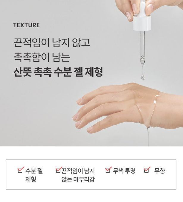 끈적임이 남지 않고 촉촉함이 남는 산뜻 촉촉 수분 젤 제형이에요!