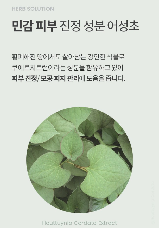 어성초는 황폐해진 땅에서도 살아남는 강인한 식물로 쿠에르치트런이라는 성분을 함유하고 있어 피부 진정과 모공 피지 관리에 도움을 줘요.