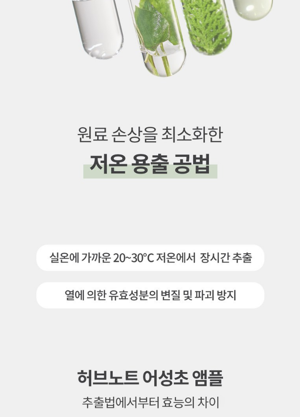 허브노트 어성초 앰플은 저온 용출 공법으로 무색 투명해요. 또한 색상을 만들기 위한 인공 색소 성분 등을 사용하지 않기 때문에 민감한 피부에 부담이 없으며 피부 착색 걱정도 없어요!