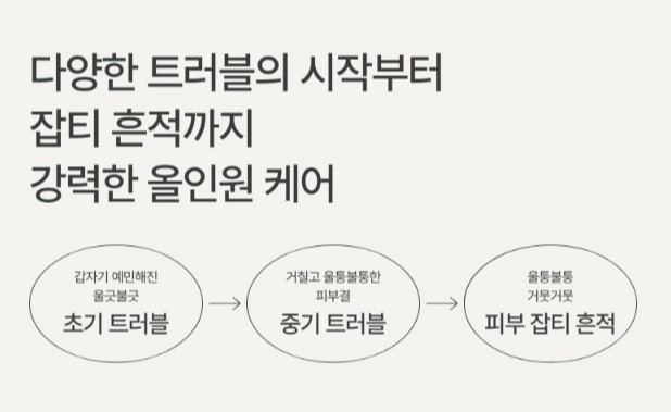 다양한 트러블의 시작, 초기 트러블부터 거칠어진 피부결의 중기 트러블, 울퉁불퉁하고 거뭇거뭇한 피부 잡티 흔적 등 다양한 트러블 케어에 좋아요.