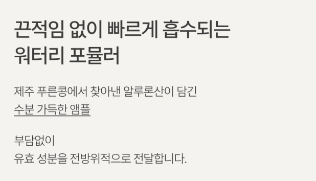 끈적임 없이 빠르게 흡수되는 워터리 포뮬러이며, 제주 푸른콩에서 찾아낸 알루론산이 담긴 수분 가득한 앰플이에요. 부담없이 유효 성분을 전방위적으로 전달해준답니다.