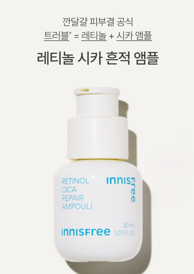 건조, 붉은기, 민감, 모공, 울퉁불퉁한 피부결 등의 트러블은 레티놀+시카 앰플로 잡아줄 수 있어요. 그래서 이니스프리 레티놀 시카 흔적 앰플이 탄생한 것이랍니다.