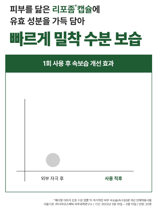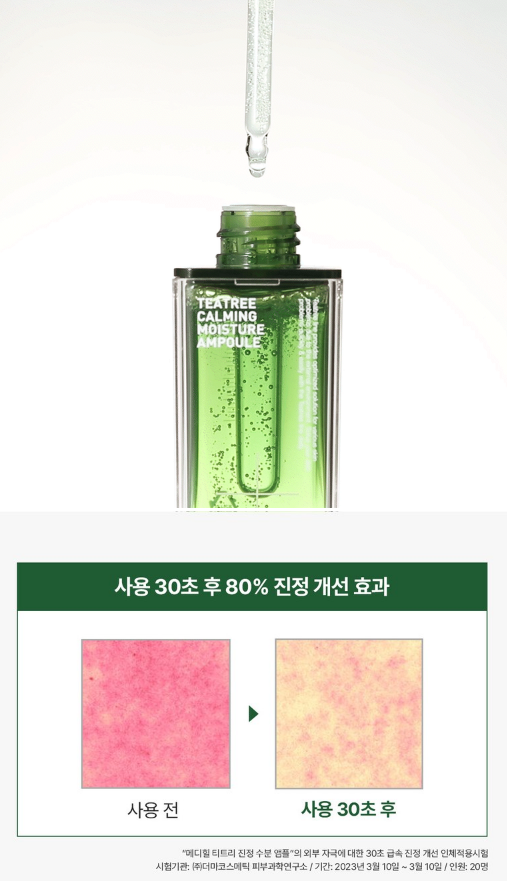30초만에 자극을 80% 낮추는 초속 진정 개선, 순수 티트리 92% 함유로 강력 진정 효과, 1회 사용으로 속보습을 110%로 높이는 밀착 수분 보습으로 효과가 훨씬 좋아졌어요:)