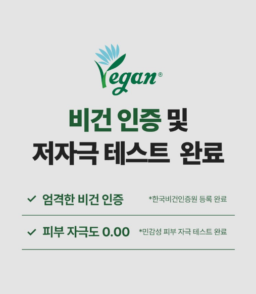 엄격한 비건 인증을 받은 제품이며, 피부 자극도 0.00으로 민감성 피부 자극 테스트도 완료된 제품이에요!