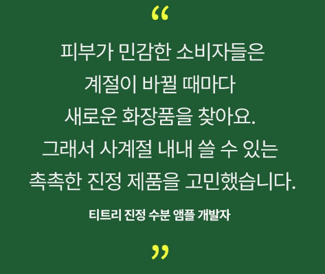 피부가 민감한 소비자들은 계절이 바뀔 때마다 화장품을 바꿔주어야하는데요. 그래서 사계절 내내 쓸 수 있는 촉촉한 진정 제품을 고민하여 만들었다고 해요.