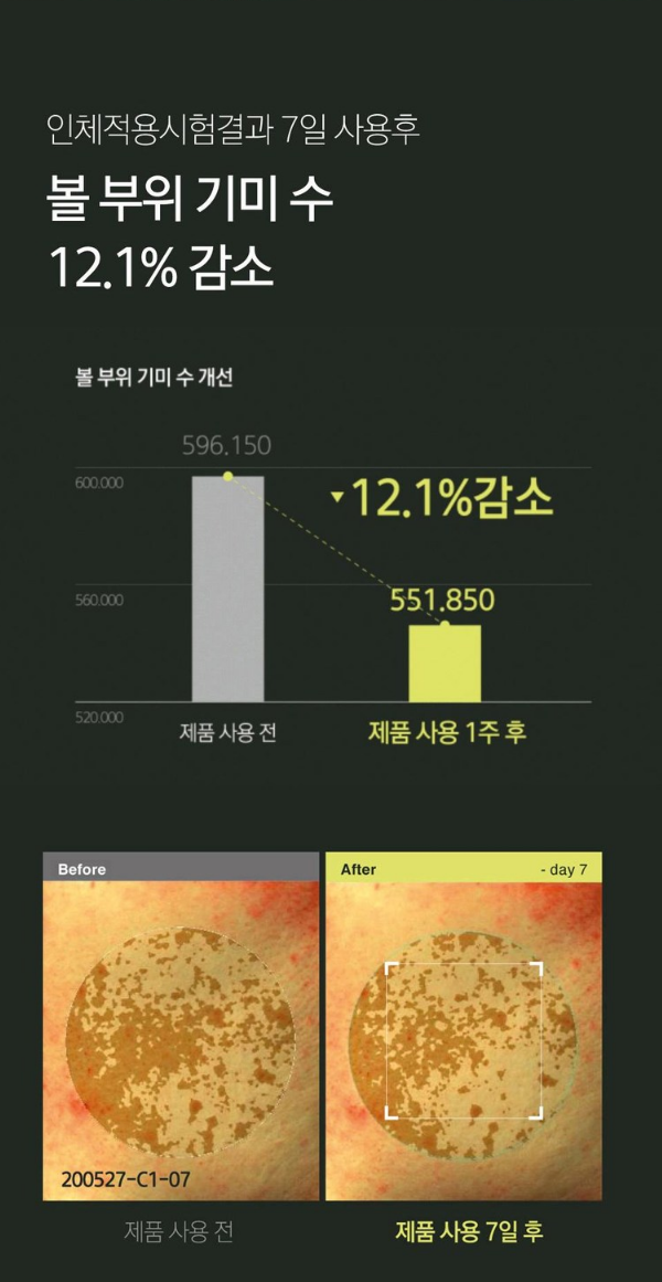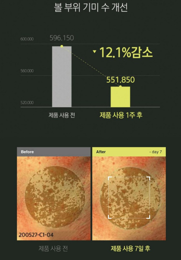 인체적용시험결과 7일 사용 후 볼 부위 기미 수가 596.150에서 12.1% 감소된 551.850으로 나타났어요!