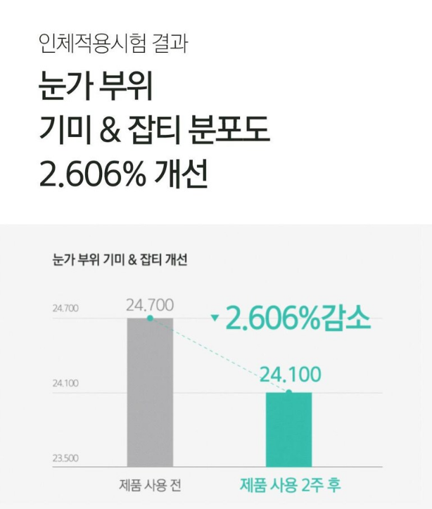 인체적용시험 결과 눈가부위 기미&잡티 분포도가 2주 후 2.606% 감소했다고 나타났어요:)