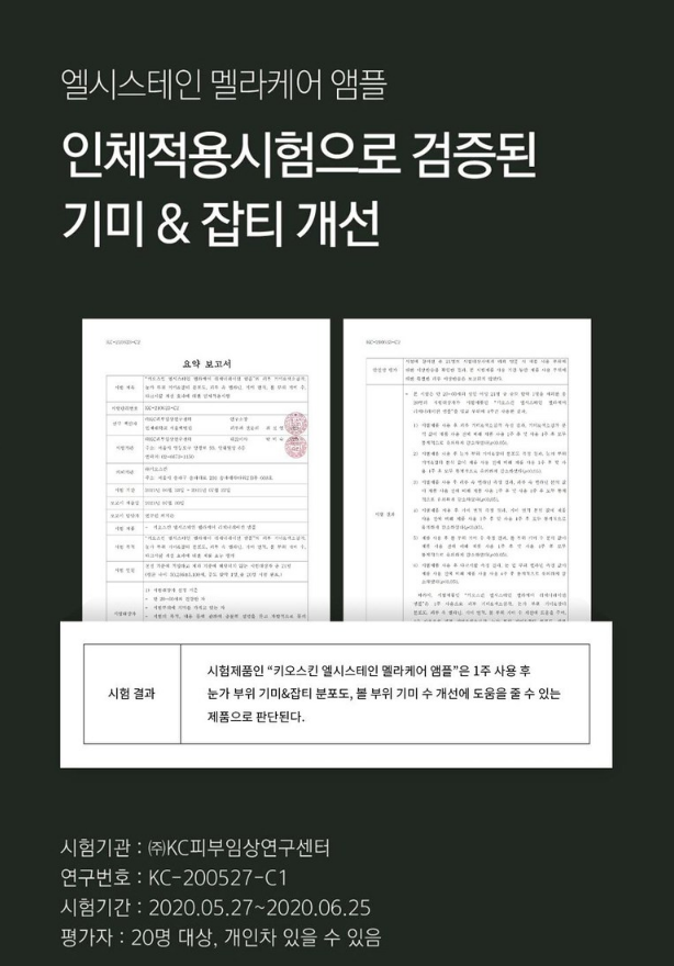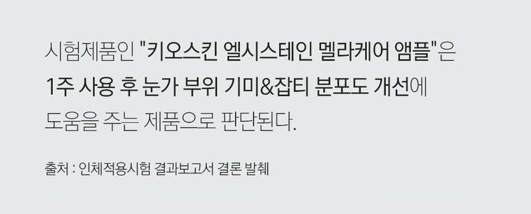 인체적용시험 결과보고서 결론에서 시험제품인 '키오스킨 엘시스테인 멜라케어 앰플'은 1주 사용 후 눈가 부위 기미&잡티 분포도 개선에 도움을 주는 제품으로 판단된다고 밝혀졌어요!