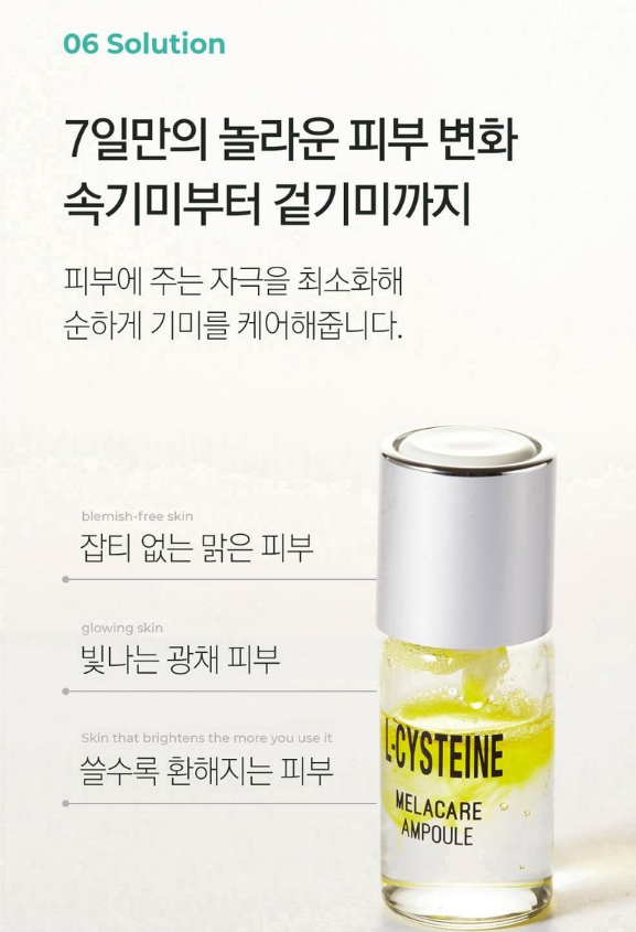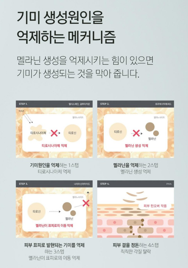 피부에 주는 자극을 최소화에 순하게 기미를 케어해줘요. 7일만에 속기미부터 겉기미까지 잡아주고, 잡티 없는 맑은 피부, 빛나는 광채 피부, 쓸수록 환해지는 피부를 느껴보실 수 있어요.
