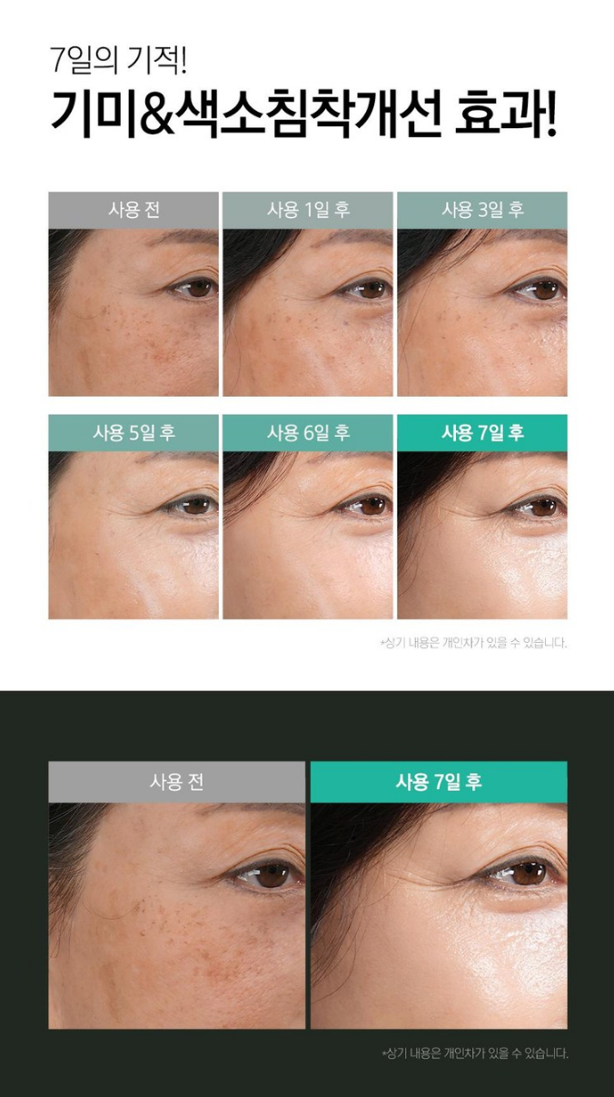 기미&색소침착개선 효과는 7일만에 나타나게 되는데요. 위 사진을 보면 확실한 차이를 보실 수 있어요!