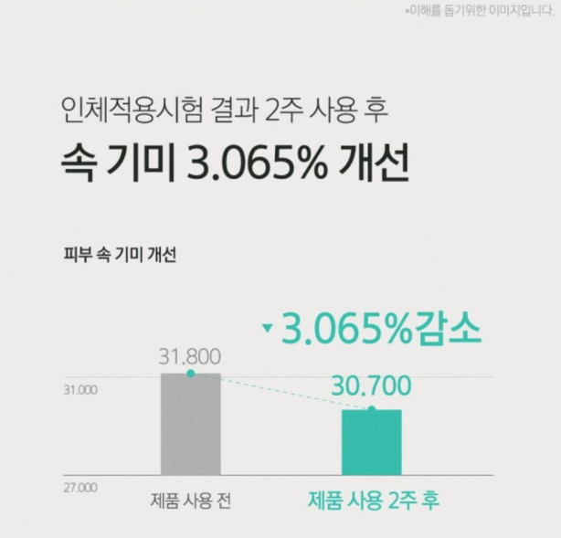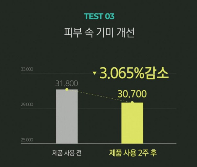 피부 속 기미도 제품 사용 전 31.800에서 제품 사용 2주 후 약 3.065% 감소한 30.700으로 나타났어요.