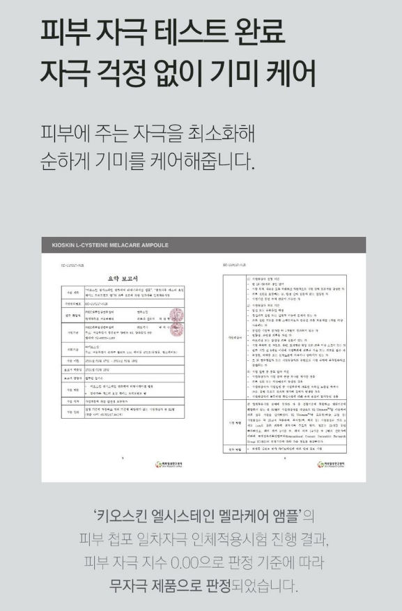 키오스킨 엘시스테인 멜라케어 앰플은 미백·기미·주름개선 기능성 화장품이며, 기미&잡티 임상완료, 피부 자극 지수 0.00 임상완료 제품이에요!