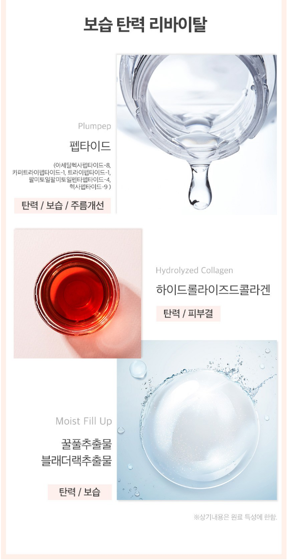 펩타이드로 탄력, 보습, 주름개선을, 하이드롤라이즈드콜라겐으로 탄력과 피부결 개선을, 꿀풀추출물 블래더랙추출물로 탄력과 보습을 도와요!
