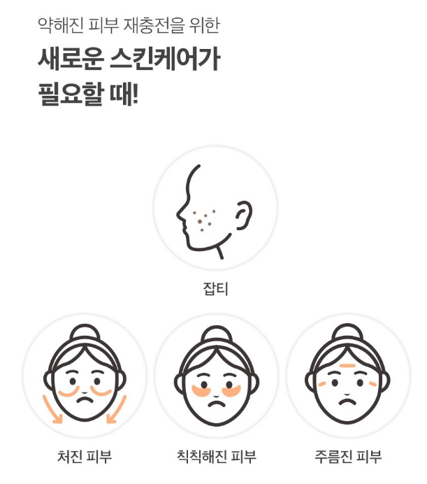 피부 잡티, 처진 피부, 칙칙해진 피부, 주름진 피부 등 약해진 피부로 인한 피부고민를 위한 새로운 스킨케어가 필요할 때예요.