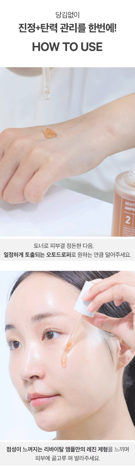 토너로 피부결 정돈 후 일정하게 토출되는 오토드로퍼로 원하는 만큼 덜어주세요. 그 후 점성이 느껴지는 리바이탈 앰플의 레진 제형을느끼며 피부에 골고루 펴발라주시면 된답니다~