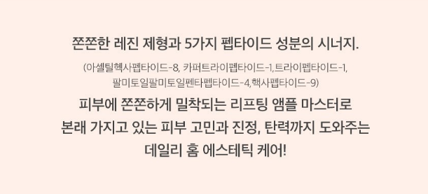 쫀쫀한 레진 제형과 5가지 펩타이드 성분의 시너지, 피부에 쫀쫀하게 밀착되는 리프팅 앰플 마스터로 본래 가지고 있는 피부 고민과 진정, 탄력까지 도와주는 데일리 홈 에스테틱 케어예요.