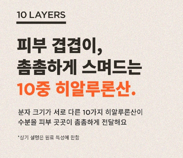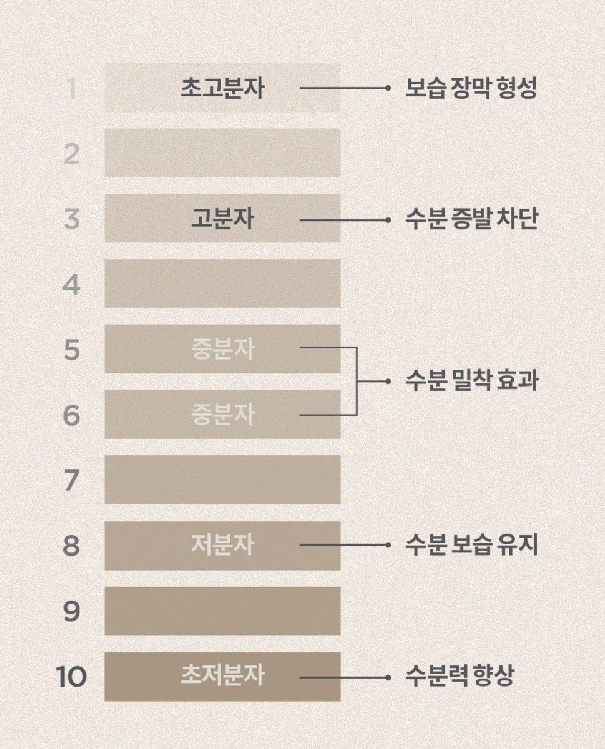 보습 장막을 형성하는 초고분자부터 수분 증발 차단을 돕는 고분자, 수분 밀착 효과가 있는 중분자, 수분 보습 유지를 돕는 저분자, 수분력 향상을 돕는 초저분자까지 분자 크기가 서로 다른 10가지 히알루론산이 수분을 피부 곳곳이 촘촘하게 전달해준답니다.