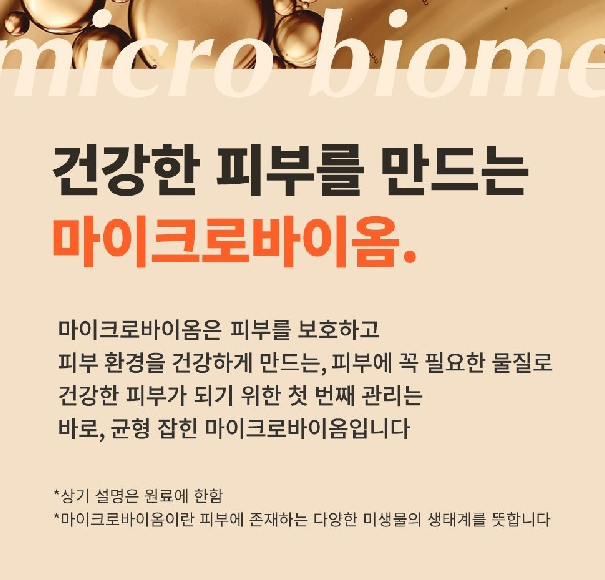 마이크로바이옴은 피부를 보호하고 피부 환경을 건강하게 만드는, 피부에 꼭 필요한 물질로 건강한 피부가 되기 위한 첫 번째 관리는 바로 균형 잡힌 마이크로바이옴이에요.