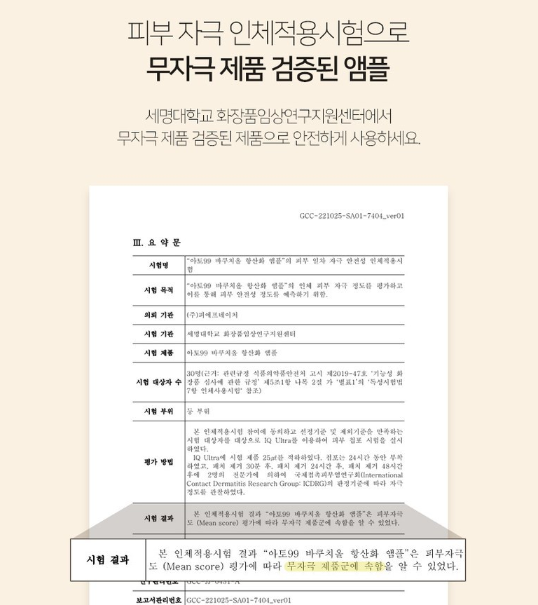 피부 자극 인체적용시험으로 무자극 제품이 검증된 앰플이에요!