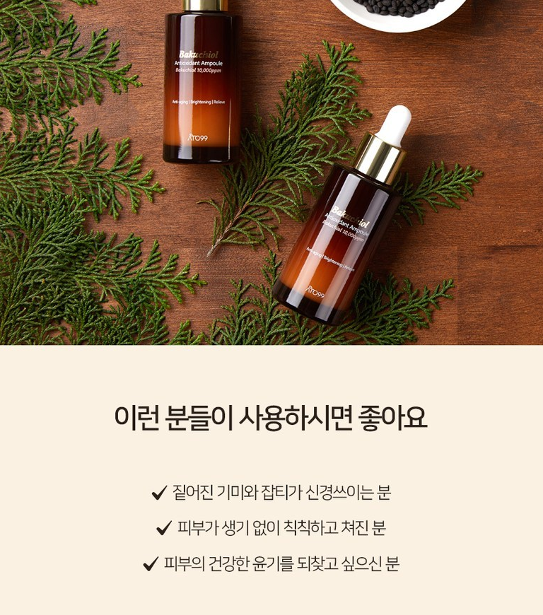 고농축 제형의 앰플로 인공향료를 넣지 않은 바쿠치올 본연의 향을 담은 제품이에요!