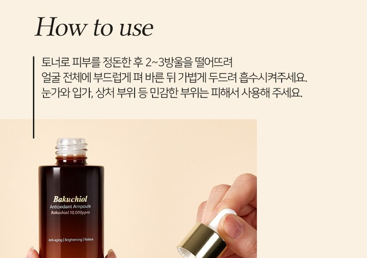 강력한 항산화 성분 바쿠치올이 10,000ppm 함유되어있어 한 달 안에 환하게 빛나는 탄력광채를 느껴보실 수 있을 거예요!