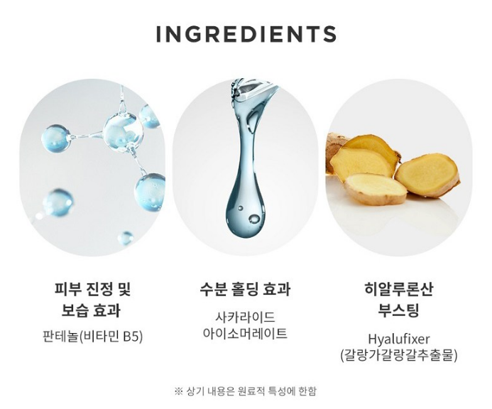 피부 진정 및 보습 효과를 주는 판테놀(비타민 B5), 수분 홀딩 효과를 주는 사카라이드 아이소머레이트, 히알루론산 부스팅을 돕는 Hyalufixer가 함유되어 있어요.