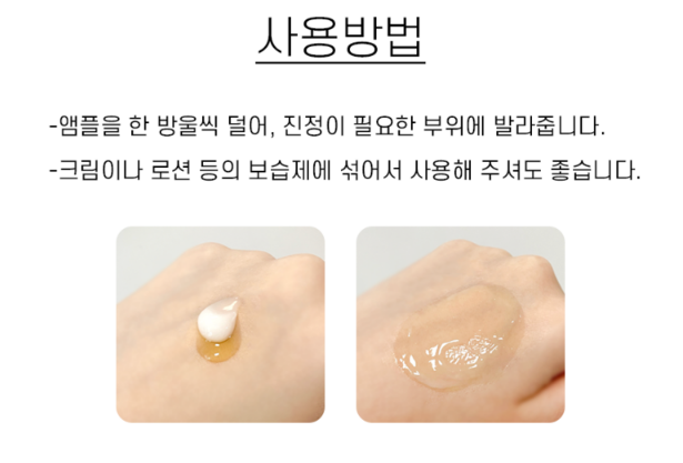 앰플을 한 방울씩 덜어, 진정이 필요한 부위에 발라주고, 크림이나 로션 등 보습제에 섞어서 사용해주셔도 돼요!