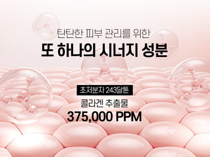 탄탄한 피부 관리를 위한 또 하나의 시너지 성분을 소개할게요. 바로 초저분자 243달톤 콜라겐 추출물인데요. 무려 375,000ppm이 함유되어 있어요.