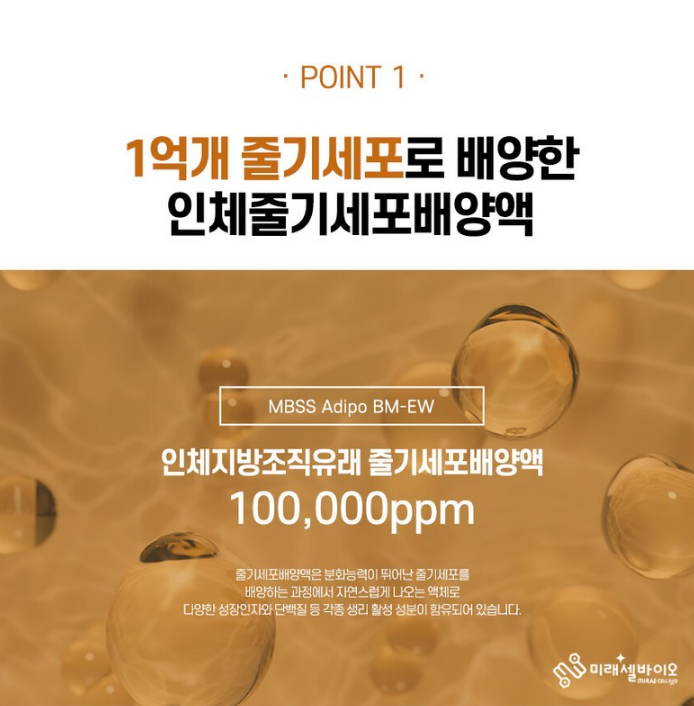 인체지방조직유래 줄기세포배양액 100,000ppm이 함유되었어요. 줄기세포배양액은 분화능력이 뛰어난 줄기세포를 배양하는 과정에서 자연스럽게 나오는 액체로 다양한 성장인자와 단백질 등 각종 생리 활성 성분이 함유되어 있어요.