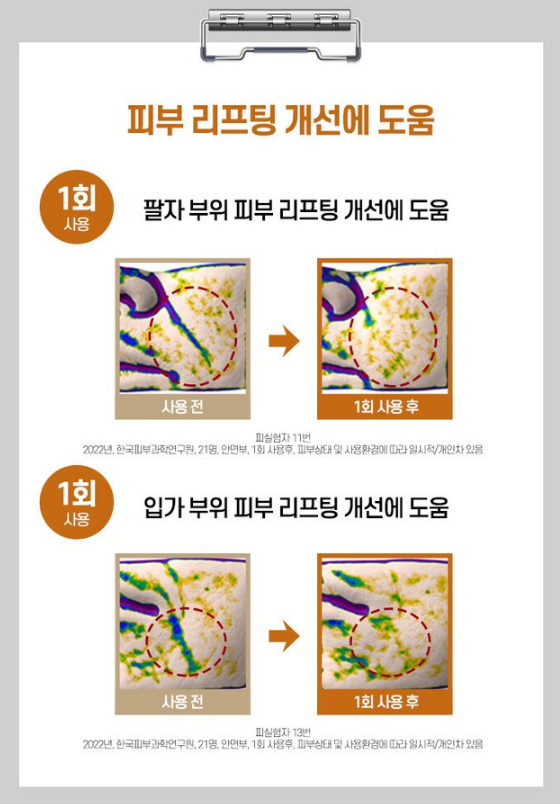 제품 1회 사용 후 팔자 부위, 입가 부위 피부 리프팅 개선에 도움을 주었다는 시험 결과가 있어요!