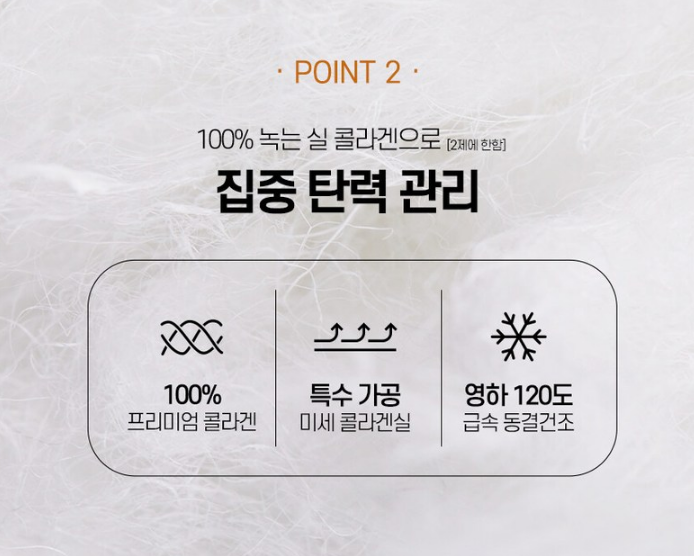 100%프리미엄 녹는실 콜라겐으로 집중 탄력 관리를 해줘요. 특수 가공된 미세 콜라겐실이며 영하 120도 급속 동결건조 과정을 거친 콜라겐이랍니다!