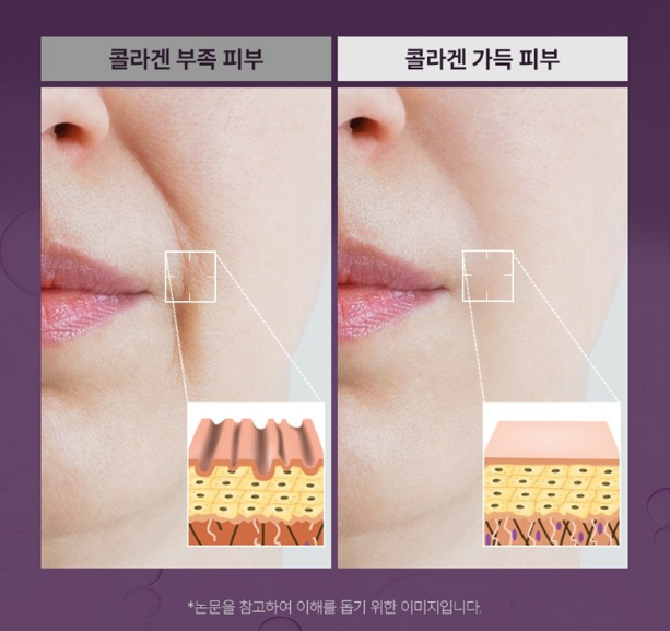 콜라겐 부족 피부와 콜라겐 가득 피부를 비교했을 때 콜라겐이 부족한 피부에서 주름이 많이 보이고 탄력이 저하된 걸 볼 수 있어요.