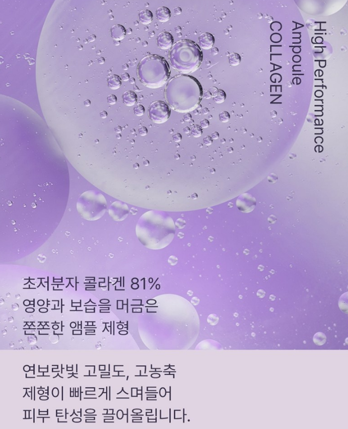 초저분자 콜라겐 81% 영양과 보습을 머금은 쫀쫀한 앰플 제형이며 연보랏빛 고밀도, 고농축 제형이 빠르게 스며들어 피부 탄성을 끌어올려줘요.