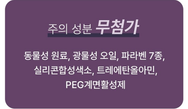 동물성 원료, 광물성 오일, 파라벤 7종, 실리콘합성색소, 트레에탄올아민, PEG계면활성제 등 주의 성분은 첨가하지 않았어요.