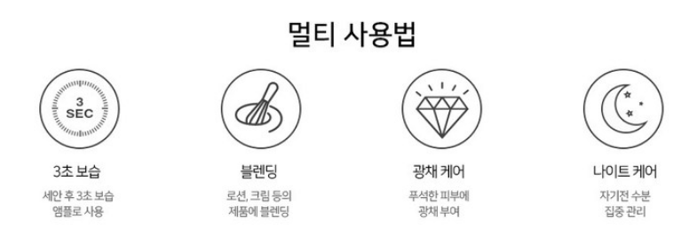 세안 후 3초 보습 앰플이나 푸석한 피부에 광채 부여 목적으로 사용하셔도 좋지만 로션, 크림 등의 제품에 블렌딩하거나 자기전 수분 집중 관리를 해주는 등 다양하게 사용할 수 있으니 참고하세요~!