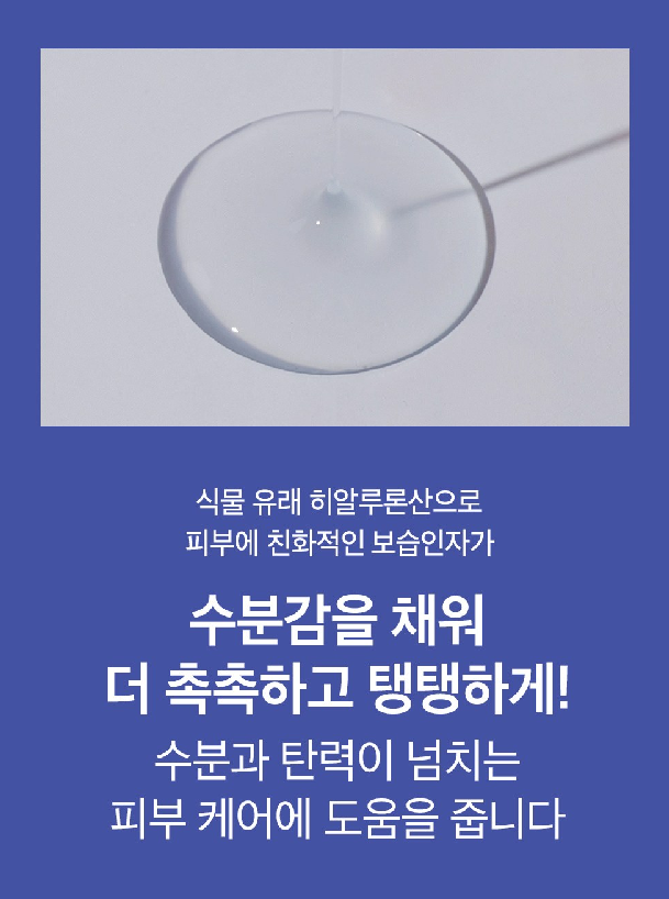 식물 유래 히알루론산으로 피부에 친화적인 보습인자가 수분감을 채워 더 촉촉하고 탱탱하게, 수분과 탄력이 넘치는 피부 케어에 도움을 줘요.