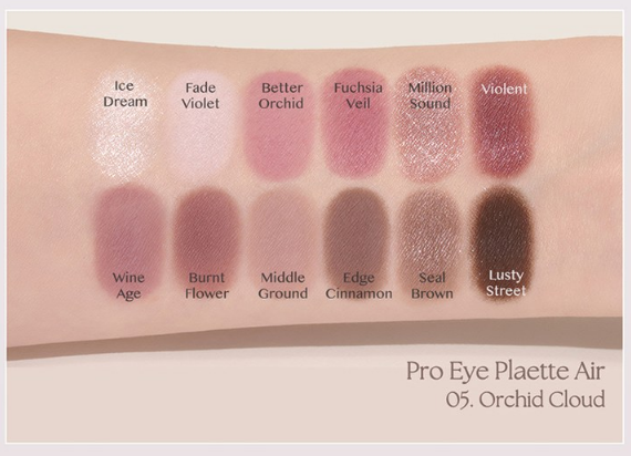 매트 타입 페이드 바이올렛, 베러 오키드, 와인 에이지, 번트 플라워, 미들 그라운드, 엣지 시나몬, 러스티 스트릿과 쉬머 타입 푸시아 베일, 바이올린트, 실 브라운과 글리터 타입 아이스 드림, 밀리언 사운드로 구성되어 있어요.