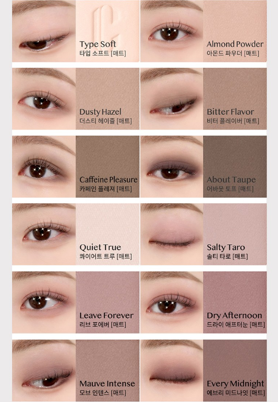 이 팔레트는 올매트 타입으로 된 게 특징이에요. 타입 소프트, 아몬드 파우더, 더스티 헤이즐, 비터 플레이버, 카페인 플레져, 어바웃 토프, 콰이어트 트루, 솔티 타로, 리브 포에버, 드라이 애프터눈, 모브 인텐스, 에브리 미드나잇으로 이루어져있어요!