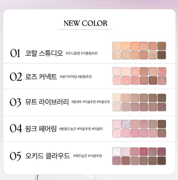 새로운 컬러조합으로 돌아왔어요! 01 코랄 스튜디오, 02 로즈 커넥트, 03 뮤트 라이브러리, 04 핑크 페어링, 05 오키드 클라우드 총 5가지 시리즈로 나왔답니다.