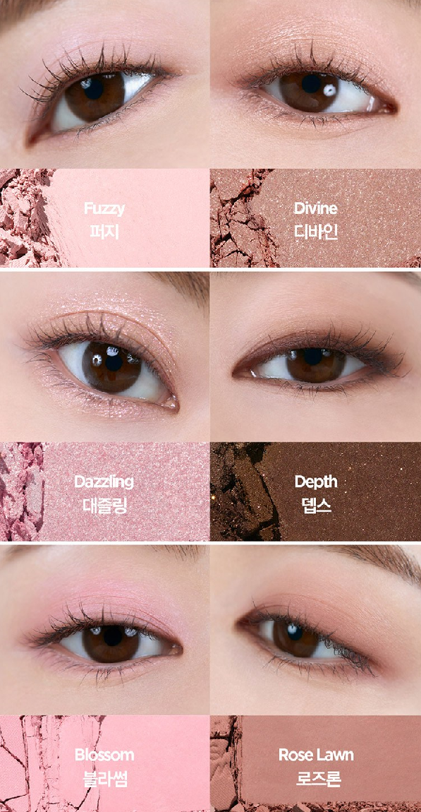 1번 퍼지는 메이크업 전 눈매를 정돈해주는 베이스 컬러로, 2번 디바인은 애교살 영역 볼륨감을 더해주는 쉬머 컬러로, 3번 대즐링은 투명하고 다채롭게 반짝이는 글리터 컬러로, 4번 뎁스는 깊은 음영이나 라이너 등 포인트 컬러로, 5번 블라썸은 눈가와 볼에 화사함을 더하는 블러쉬 컬러로, 6번 로즈론은 쌍꺼풀, 언더라인 음영을 잡아주는 매트 컬러로 사용해보세요!