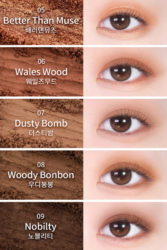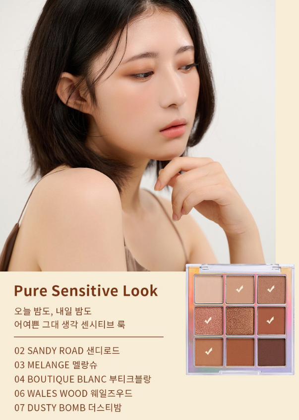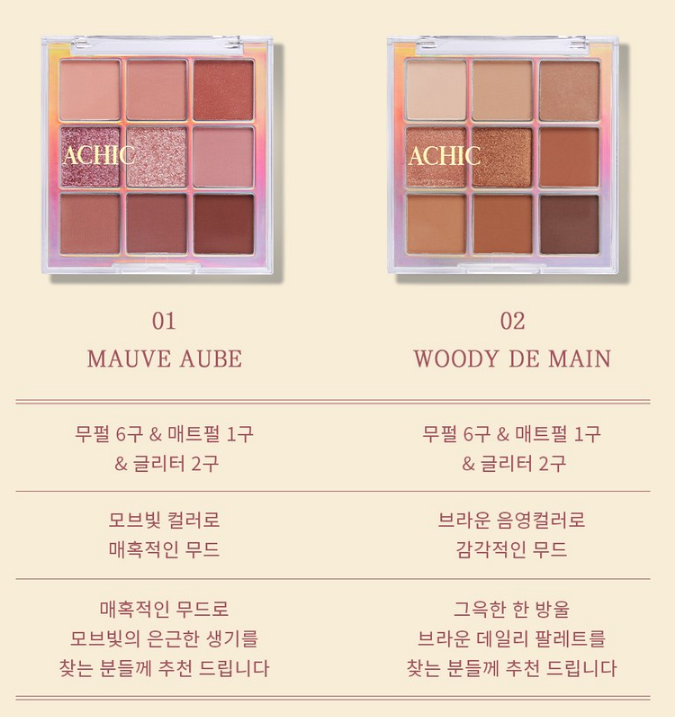 01호는 무펄 6구&매트펄 1구&글리터 2구로 구성되어 있으며 모브빛 컬러로 매혹적인 무드를 담았어요. 모브빛의 은근한 생기를 찾는 분들께 추천드려요. 또 02호는 무펄 6구&매트펄 1구&글리터 2구로 구성되어 있고 브라운 음영컬러로 감각적인 무드를 담았어요. 그윽한 한 방울 브라운 데일리 팔레트를 찾는 분들께 추천드려요 :)