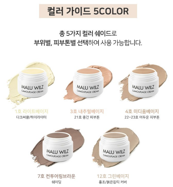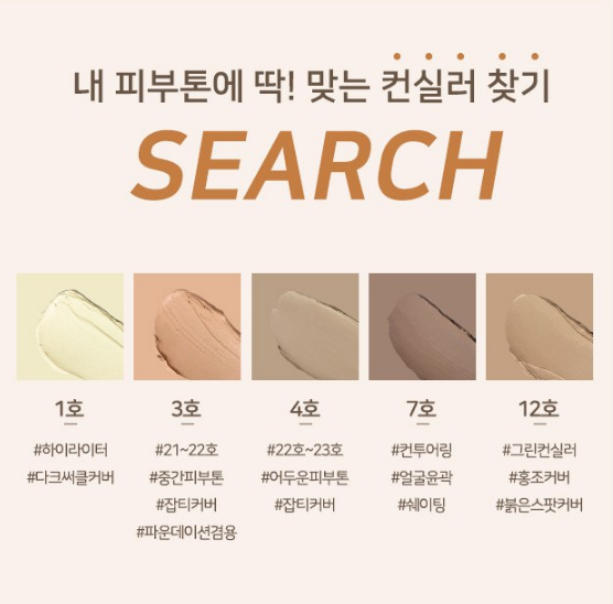 1호 라이트베이지, 3호 내추럴베이지, 4호 미디움베이지, 7호 컨투어링브라운, 12호 그린베이지 등 5가지 색상으로 부위별, 피부톤별로 선택하여 사용 가능해요.