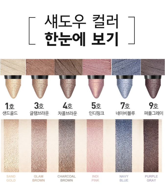 1호 샌드골드, 3호 글램브라운, 4호 차콜브라운, 5호 인디핑크, 7호 네이비블루, 9호 퍼플그레이 총 6가지 컬러로 구성되어 있어요.