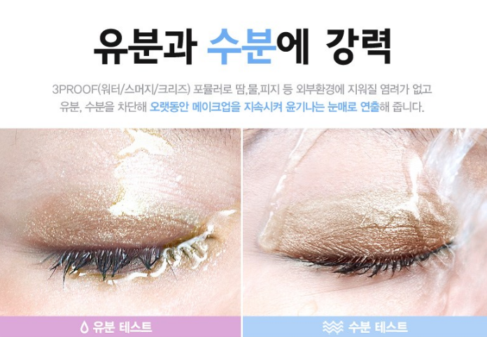 3프루프(워터/스머지/크리즈) 포뮬러로 땀, 물, 피지 등 외부환경에 지워질 염려가 없고 유분, 수분을 차단해 오랫동안 메이크업을 지속시켜 윤기나는 눈매로 연출해줘요.