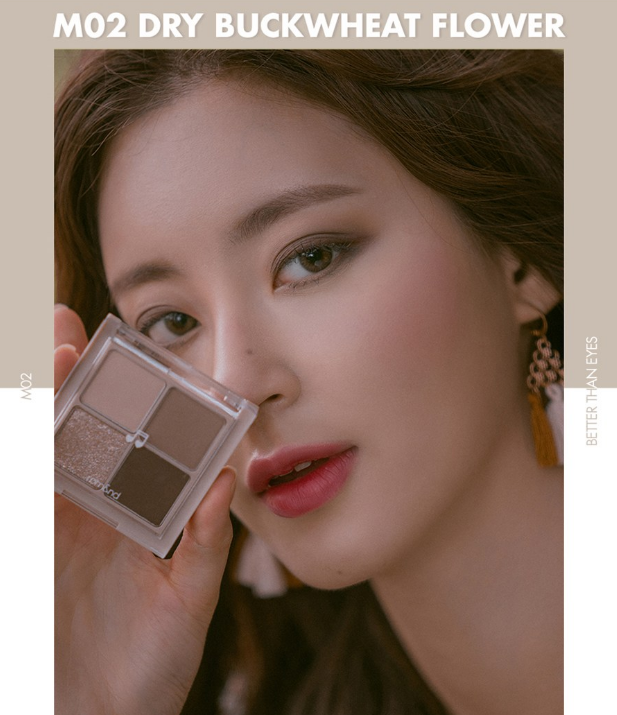 눈가를 환하게 밝혀줄 스킨톤의 베이스 컬러 소프트 위트, 잘 말린 메밀과 같은 회갈색 매트 포인트 컬러 굿 그레이, 은은하게 그레이빛이 감도는 촉촉 은하수 펄 글리터 샤이니 벅위트, 다크한 그레이에 브라운 한방울을 더한 딥한 음영 컬러 다크 그레이