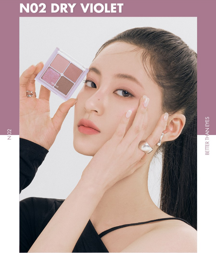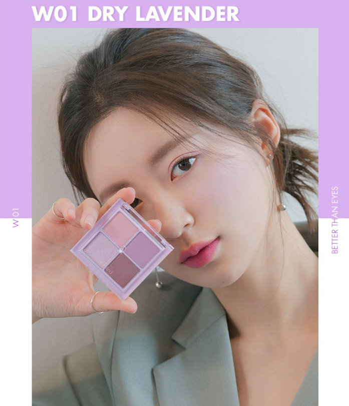 뽀얀 보랏빛 베이지 컬러인 소프트 라벤더, 여쿨라이트를 위한 뽀얀 보랏빛 매트 포인트 컬러인 라벤더 밀크, 유니콘처럼 신비로운 빛을 내는 촉촉 은하수 펄 글리터인 트윙클 퍼플, 라이트톤을 위한 탁함 없는 부드러운 퍼플브라운으로 구성되어 있어요.