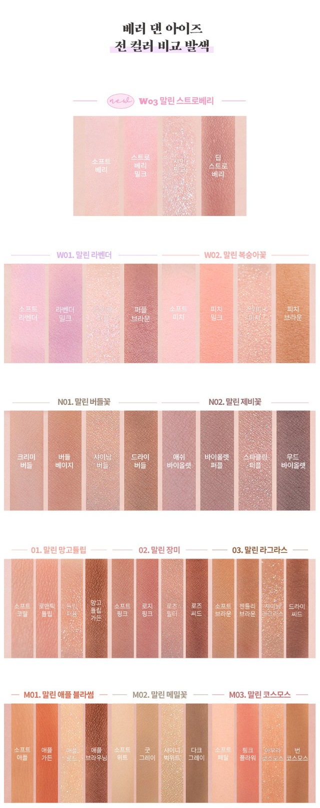 뽀얀 핑크빛 베이스 소프트 베리, 여쿨라이트를 위한 뽀얀 딸기우윳빛 매트 포인트 컬러인 스트로베리 밀크, 청량하게 반짝이는 핑크 펄 글리터인 샤인 핑크, 여쿨라이트를 위한 부드러운 핑크브라운 음영컬러인 딥 스트로베리로 구성되었어요!
